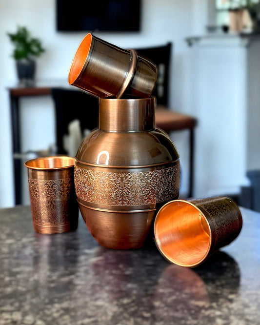 Copper Surahi/ Vessel in Antique Style Engraving with Two Glasses - Chocolate Brown in Colour. 1000 ml