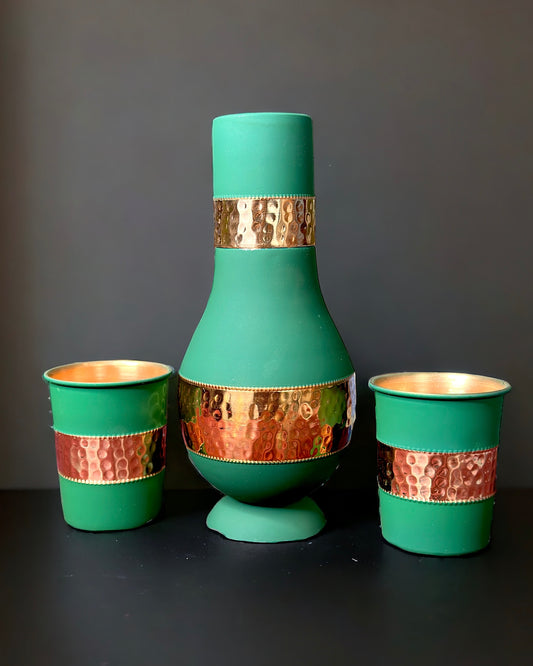 Copper Matt Finish Green Surahi with Two Glasses - Chocolate Brown, 1000 ml