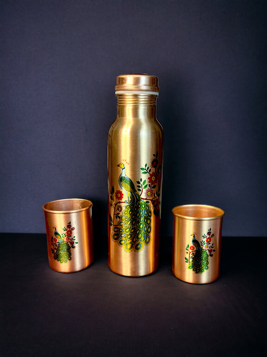 Copper Bottle with Two Glasses Peacock Design - 900 ml