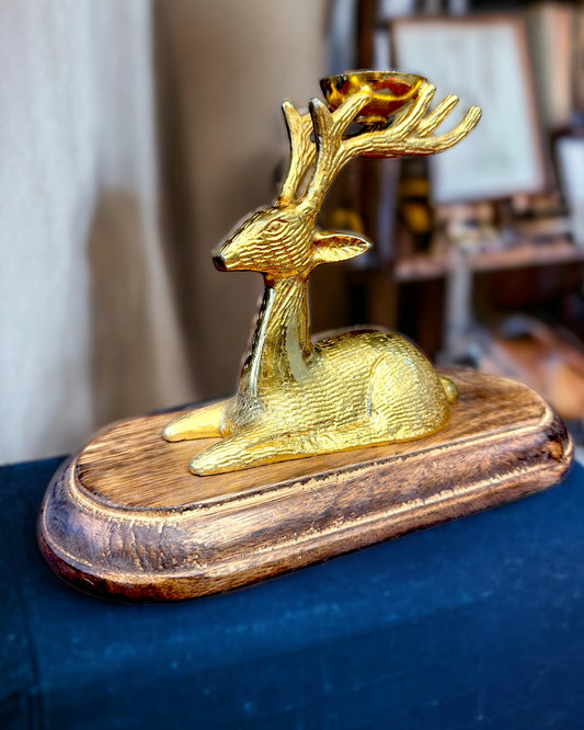 Brass Deer on Wooden Plaque Candle Holder - 9 inches