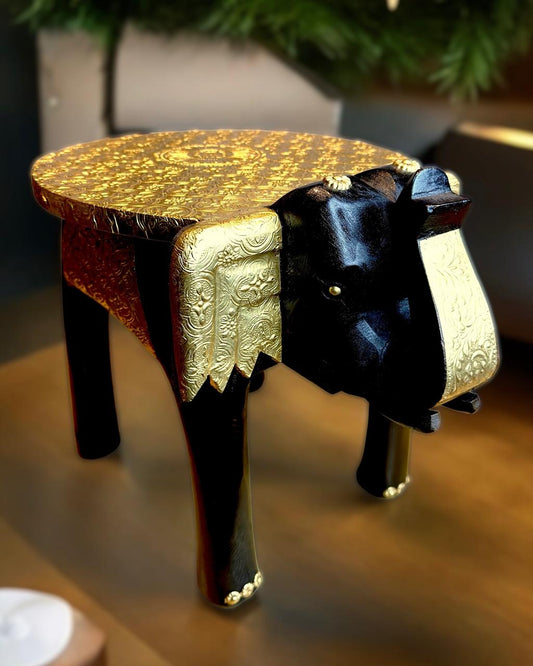 Handcrafted Elephant Stool Fitted with Pure Brass Embossed Sheet 12 inch