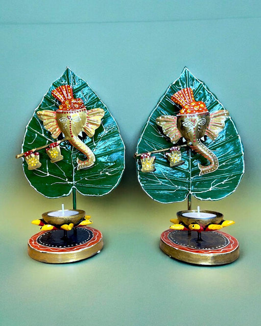 Handcrafted Leaf Ganesha Tealight Candle Holder for Home Décor Set of 2