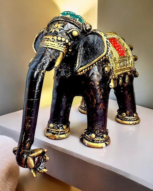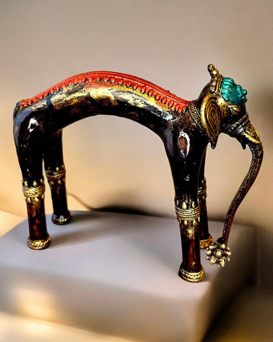 Pure Brass Elephant Sculpture Hand painted Mohenjo-daro Dhokra Art Multicolour 6.5 inch