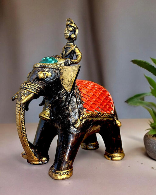 Pure Brass Elephant Mohenjo-daro Dhokra Art with Man Sculpture 4.5 inch