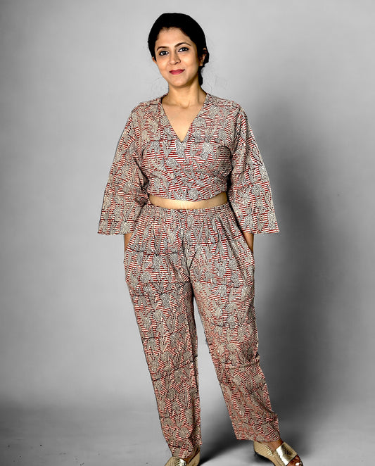 Artisanal Handblock, Crop Top Co-ord Set, Red Stripes and Leafy Print