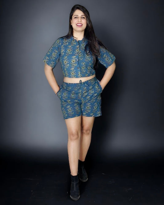Artisanal Handblock Printed Co-ord Set (Shorts and Crop Top) in Indigo Blue