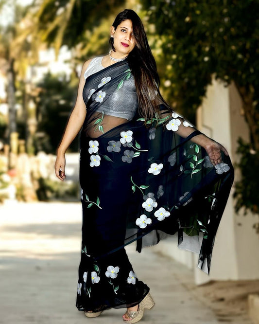 Hand Painted Chiffon Designer Saree - Black with White Flowers with Blouse Piece
