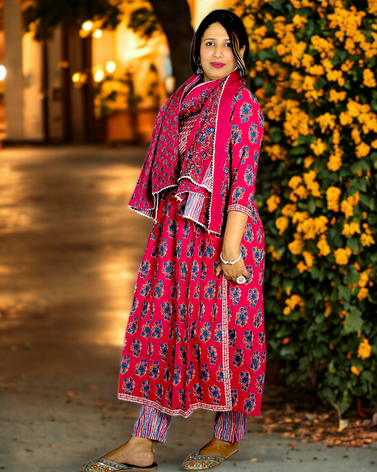 Anarkali Handblock Print 3 Piece Suit with Striped Pants and Cotton Dupatta